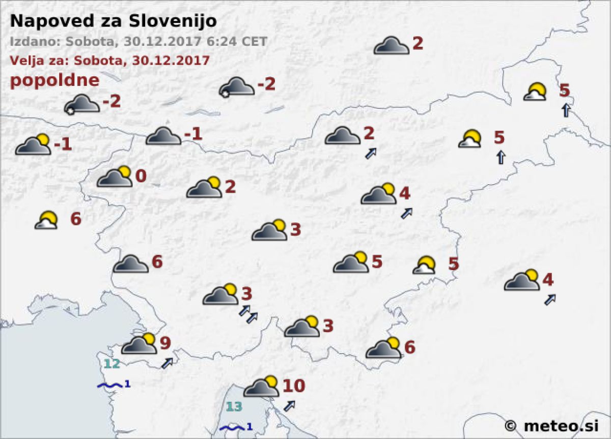 Predvsem na Notranjskem in na severovzhodu bo čez dan pihal jugozahodnik. Najvišje dnevne temperature bodo od 3 do 6, v alpskih dolinah severne Slovenije okoli 0, ob morju do 9 °C.