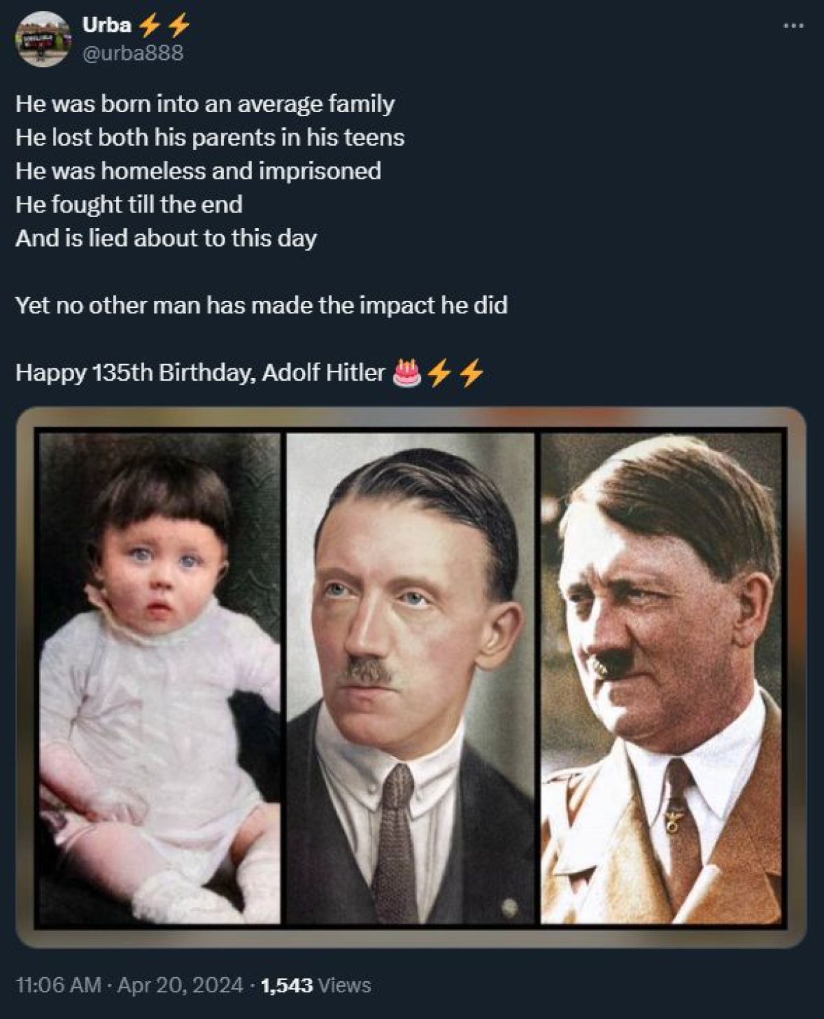 Še več, največjemu zločincu 20. stoletja je posvetil zapis na njegov rojstni dan: »Rodil se je v povprečni družini. V najstniških letih je izgubil oba starša. Bil je brezdomec in zaprt. Boril se je do konca in še danes se o njem laže. Vendar noben drug človek ni imel takšnega vpliva, kot ga je imel on. Vse najboljše za 135. rojstni dan, Adolf Hitler.«