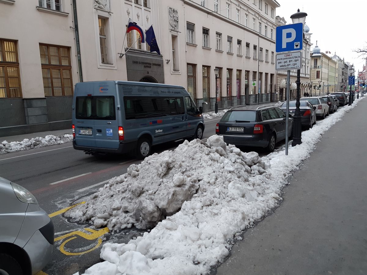 Tako so na Miklošičevi cesti sredi Ljubljane nasproti ZZZS pri zadnjem sneženju, od katerega je minilo že več kot deset dni, na parkirno mesto za invalide navozili ogromen kup snega.
