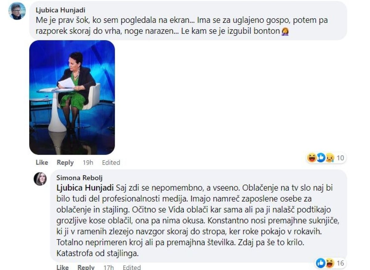 Drugo, kar je padlo v oči gledalcem, je bilo, kako je bila Petrovčičeva oblečena, namreč v krilo z visokim razporkom, ki ni dopuščajo preveč presedanja na stolu. V komentarjih na facebooku je bilo jar nekaj opazk na to temo, publicistka in blogerka Simona Rebolj je denimo zapisala: »Saj zdi se nepomembno, a vseeno. Oblačenje na tv slo naj bi bilo tudi del profesionalnosti medija. Imajo namreč zaposlene osebe za oblačenje in stajling. Očitno se Vida oblači kar sama ali pa ji nalašč podtikajo grozljive kose oblačil, ona pa nima okusa. Konstantno nosi premajhne suknjiče, ki ji v ramenih zlezejo navzgor skoraj do stropa, ker roke pokajo v rokavih. Totalno neprimeren kroj ali pa premajhna številka. Zdaj pa še to krilo. Katastrofa od stajlinga.«