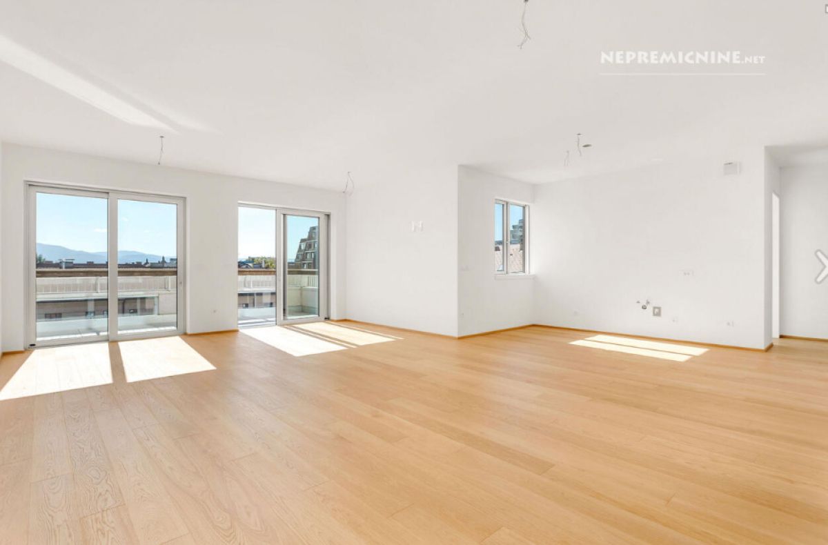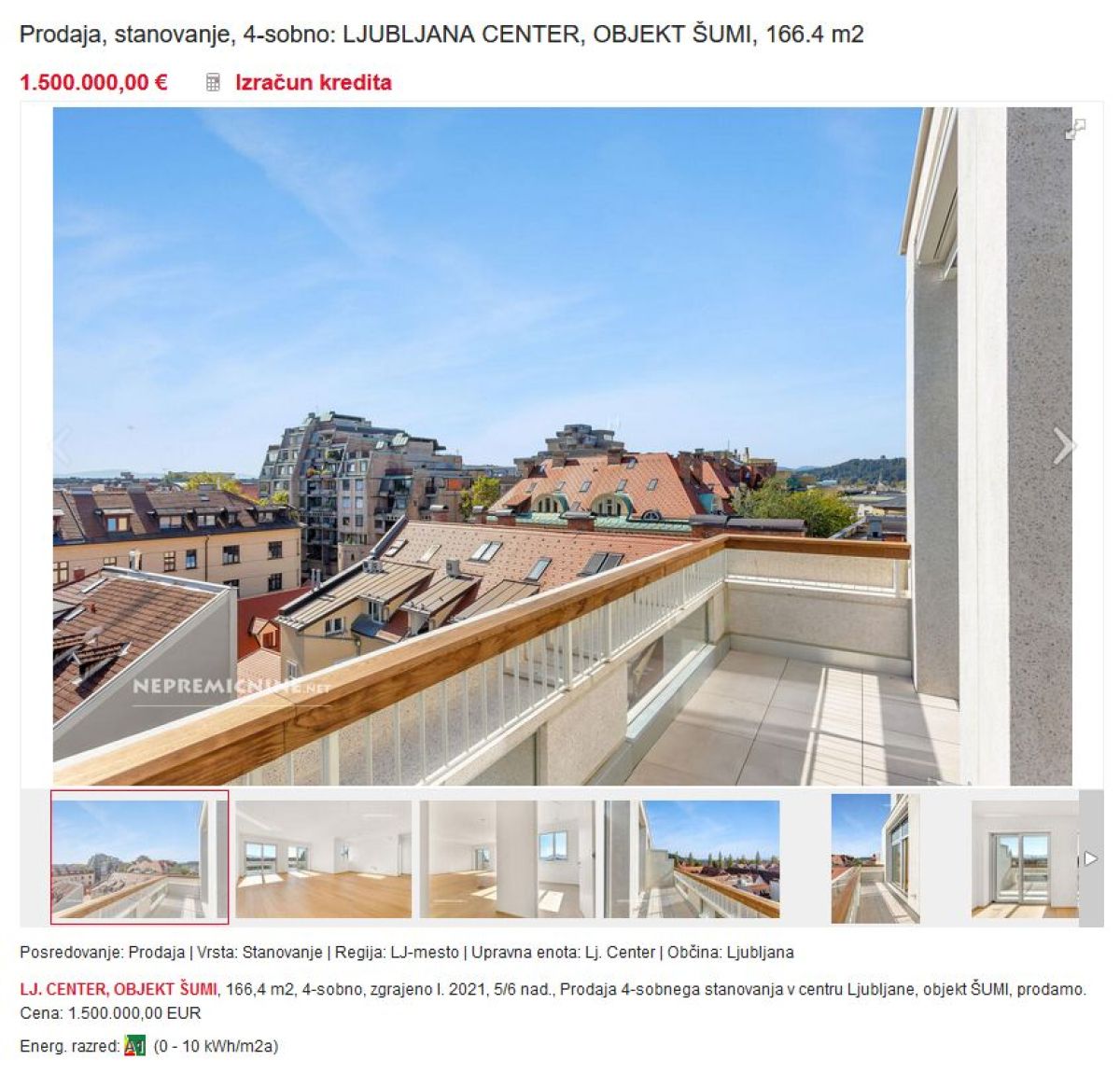 Štirisobno stanovanje je naprodaj za 1,5 milijona evrov, torej dobrih devet tisoč evrov za kvadratni meter. Stanovanje je obrnjeno na jug proti Ljubljanskem barju in ne proti vzhodu, kjer je Ljubljanski grad. Razgled nanj bi se najbrž plačal še kak tisočak na kvadratni meter več. Poleg treh spalnic sta še dve kopalnici, ločen WC, dnevna soba z jedilnico, kuhinja, hodnik in utiliti. Stanovanju pripada tudi velika terasa, dostopna iz dnevnega prostora, in trije francoski balkoni, ki so dostopni iz spalnic. Poleg tega bosta lastniku na voljo dve parkirni mesti v garažni hiši in shramba v kleti.