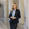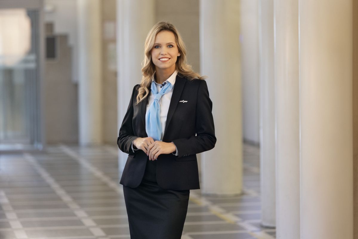 Suknjič s srebrnim logotipom, bela srajca z modrimi poudarki, kravata ali rutka z diskretnim potiskom – vse deluje preprosto, a dovršeno. Barvna kombinacija temno modre in bele simbolizira zanesljivost, zaupanje in svežino.