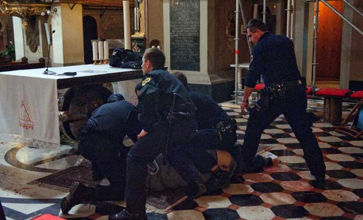 V cerkvi v središču Ljubljane grozil z nožem, nato porezal sebe