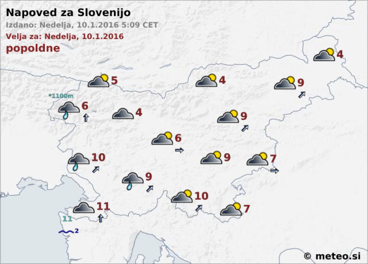 Danes bo sprva oblačno, čez dan se bo predvsem v severovzhodnih krajih delno zjasnilo. Ponekod na zahodu bo občasno spet rahlo deževalo. Pihal bo jugozahodnik. Najvišje dnevne temperature bodo od 4 do 10, ob morju do 12 stopinj C.