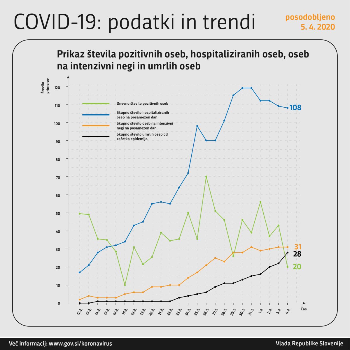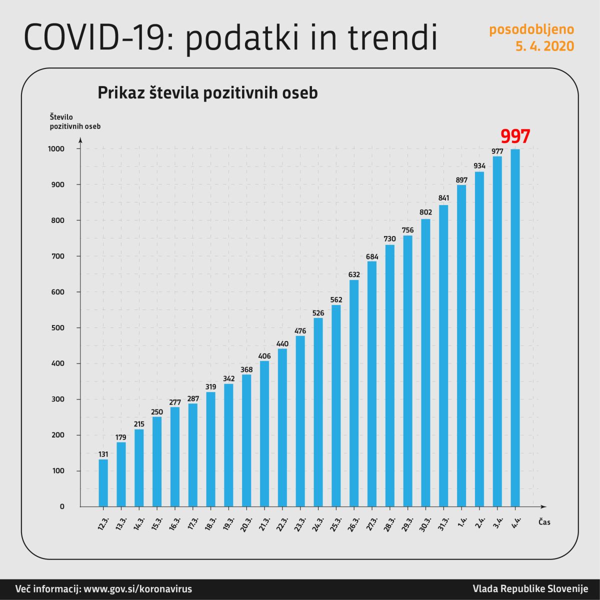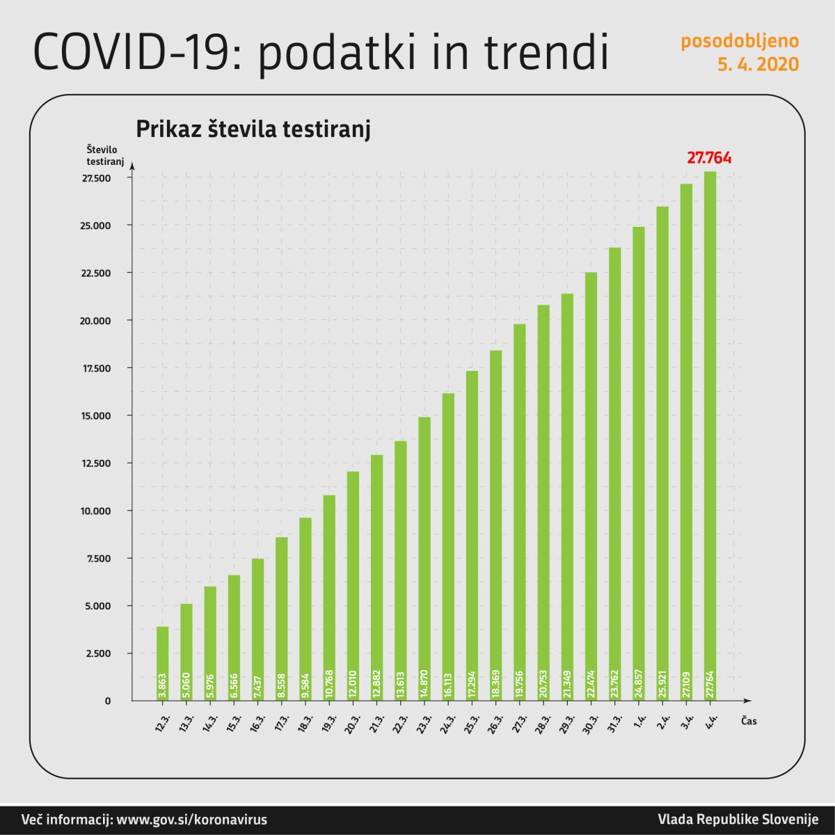 Do 4.4.2020 do 24. ure je bilo opravljenih 27.764 testiranj, od tega je bilo 1009 pozitivnih testov.