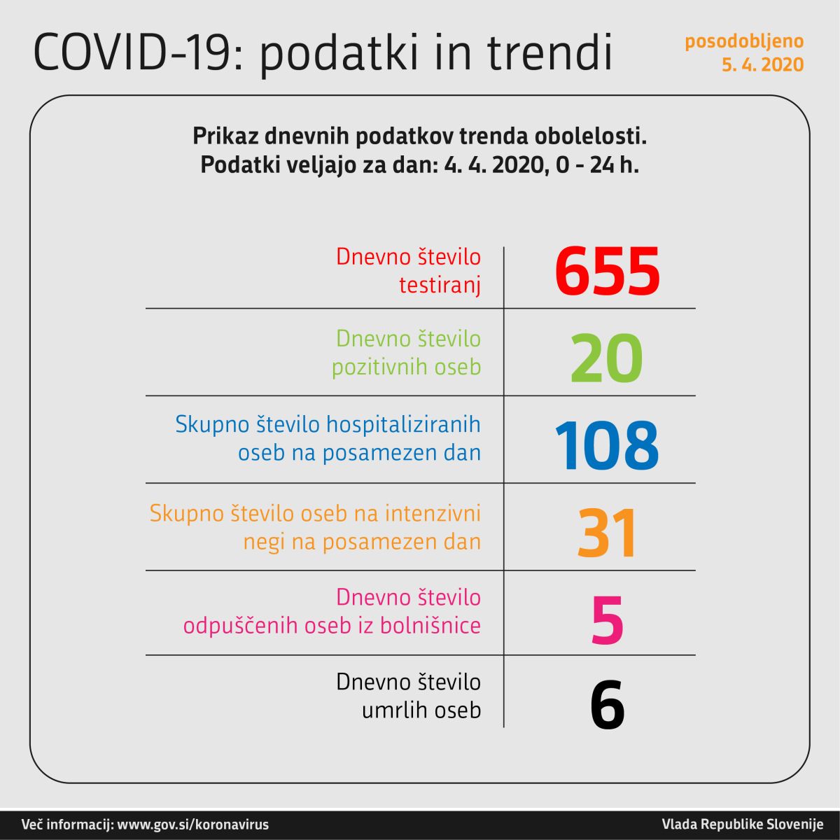 Po podatkih, ki jih je objavila Vlada Republike Slovenije, je bilo v soboto v Sloveniji opravljenih 655 testiranj na okužbo z novim koronavirusom. Potrjenih je bilo 20 novih okužb, umrlo je 6 oseb. Na včerajšnji dan je bilo hospitaliziranih 108 oseb, od tega 31 na intenzivnih odelkih. 5 oseb je bilo odpuščenih iz bolnišnic.