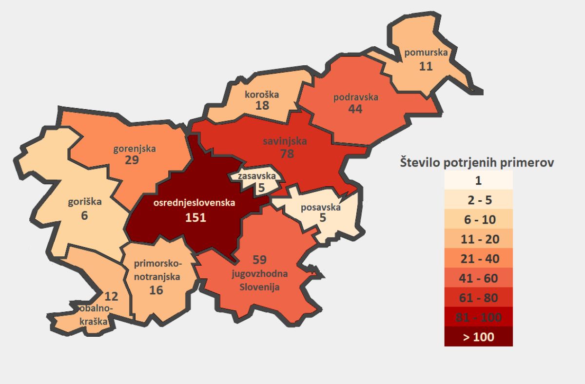 Danes, do 10. ure je bilo na NIJZ sporočeno 440 potrjenih primerov z novim koronavirusom (SARS-CoV-2). Po epidemioloških podatkih obolele osebe prihajajo iz naslednjih statističnih regij : 151 iz osrednjeslovenske, 78 iz savinjske, 59 iz jugovzhodne Slovenije, 44 iz podravske, 29 iz gorenjske, 18 iz koroške, 16 iz primorsko-notranjske, 12 iz obalno-kraške, 11 iz pomurske, šest iz goriške ter pet iz posavske in zasavske regije. Šest obolelih je tujih državljanov.