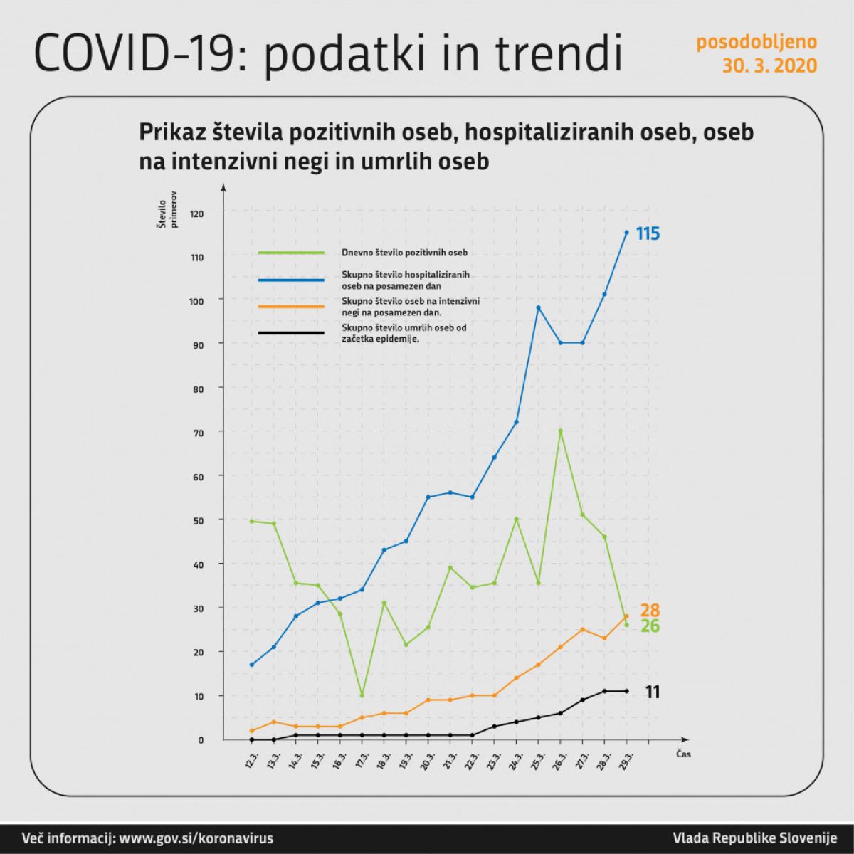 Prikaz števila pozitivnih oseb, hospitaliziranih oseb, oseb na intenzivni negi in umrlih oseb: