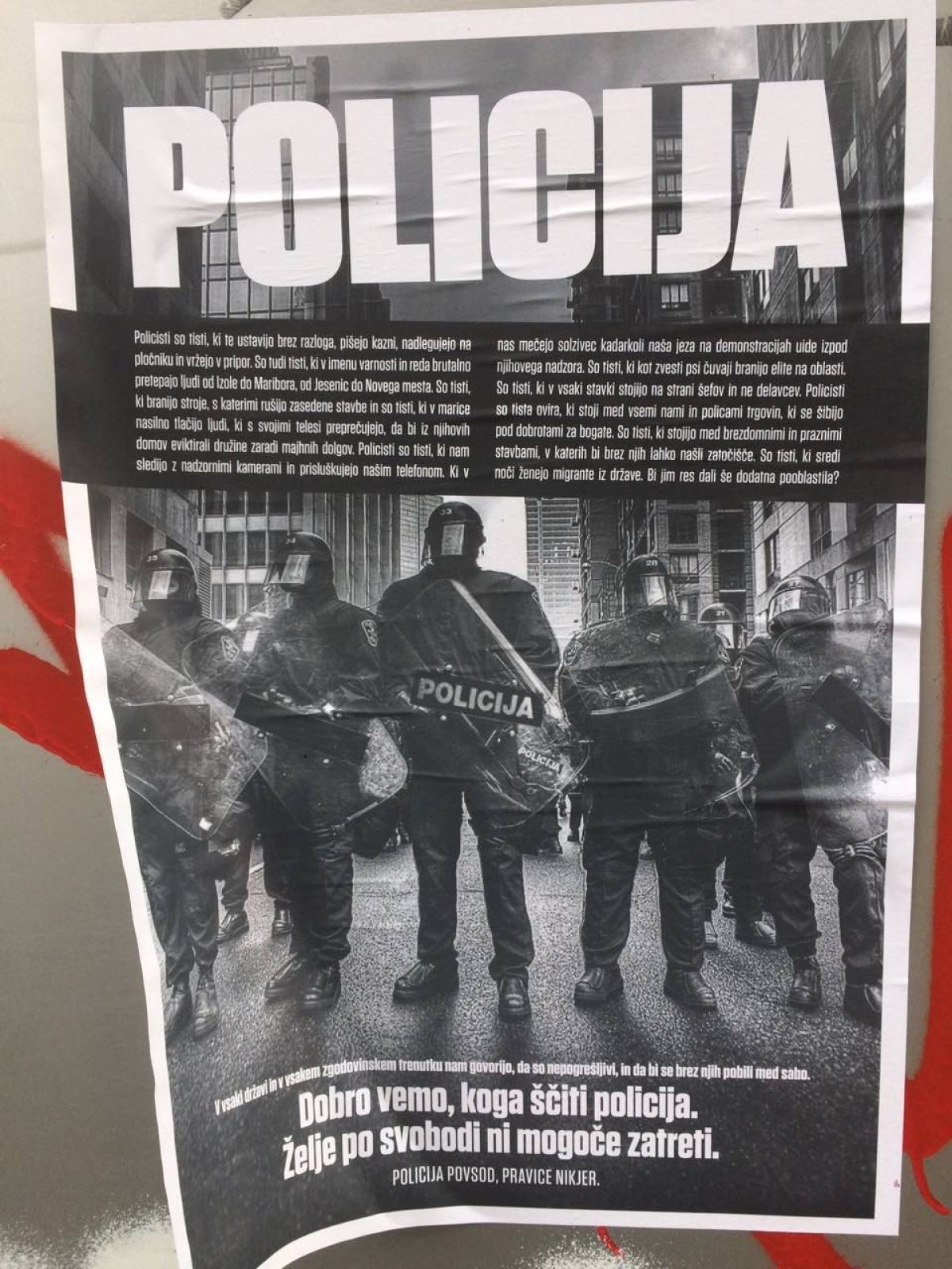 "Policisti so tisti, ki je ustavijo brez razloga, pišejo kazni, nadlegujejo na pločniku in vržejo v pripor. So tudi tisti, ki v imenu varnosti in reda brutalno pretepajo ljudi od Izole do Maribora, od Jesenic do Novega mesta. So tisti, ki branijo stroje, s katerimi rušijo zasedene stavbe in so tisti, ki v marice nasilno tlačijo ljudi, ki s svojimi telesi preprečujejo, da bi iz njihovih domov eviktirali družine zaradi majhnih dolgov. Policisti so tisti, ki nam sledijo z nadzornimi kamerami in prisluškujejo našim telefonom. Ki v nas mečejo solzivec kadarkoli naša jeza na demonstracijah uide iz našega nadzora. So tisti, ki kot zvesti psi čuvaji branijo elito na oblasti. So tisti, ki v vsaki stavki stojijo na strani šefov in ne delavcev. Policisti so tista ovira, ki stoji med vsemi nami in policami trgovin, ki se šibijo pod dobrotami za bogate. So tisti, ki stojijo med brezdomnimi in praznimi stavbami, v katerih bi brez njih lahko našli zatočišče. So tisti, ki sredi noči ženejo migrante iz države. Bi jim res dali še dodatna pooblastila?"