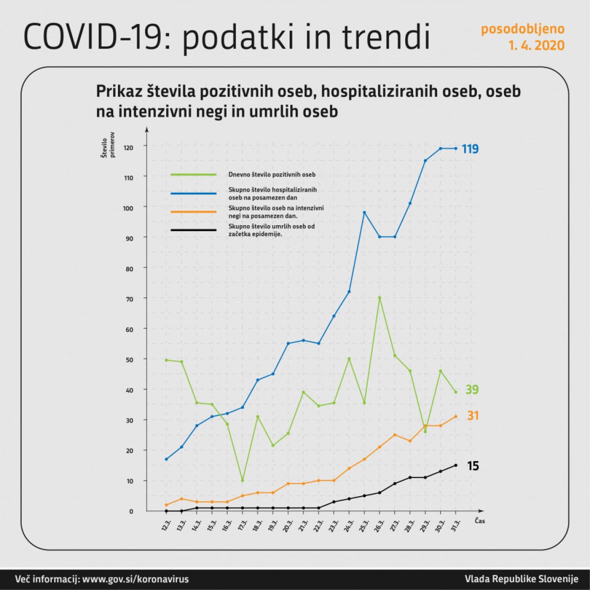 Prikaz števila pozitivnih oseb, hospitaliziranih oseb, oseb na intenzivni negi in umrlih oseb:
