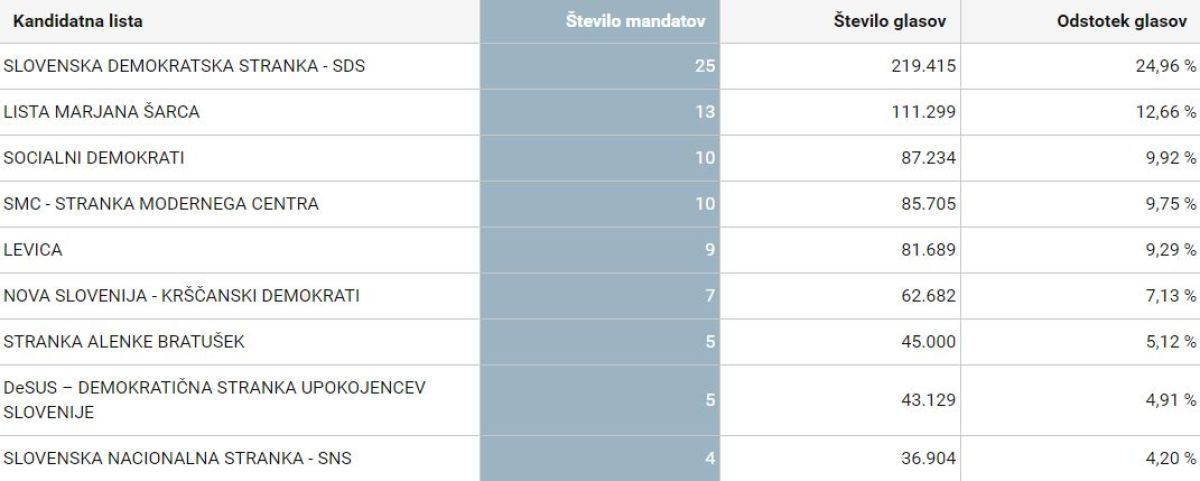 SDS bo po trenutnem izračunu v DZ dobila 25 poslanskih sedežev, LMŠ pa 13. Na tretje mesto so volivci postavili SD, ki so ji namenili 9,95 odstotka glasov oziroma deset mandatov v DZ. Enako število poslanskih mest bo imela SMC, ki je prejela 9,75 odstotka glasov.