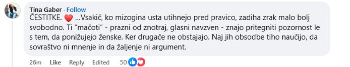 Med tistimi, ki so Kovačevi v komentarjih na facebooku čestitali, je tudi Tina Gaber. »ČESTITKE. …Vsakič, ko mizogina usta utihnejo pred pravico, zadiha zrak malo bolj svobodno. Ti “mačoti” - prazni od znotraj, glasni navzven - znajo pritegniti pozornost le s tem, da ponižujejo ženske. Ker drugače ne obstajajo. Naj jih obsodbe tiho naučijo, da sovraštvo ni mnenje in da žaljenje ni argument.«