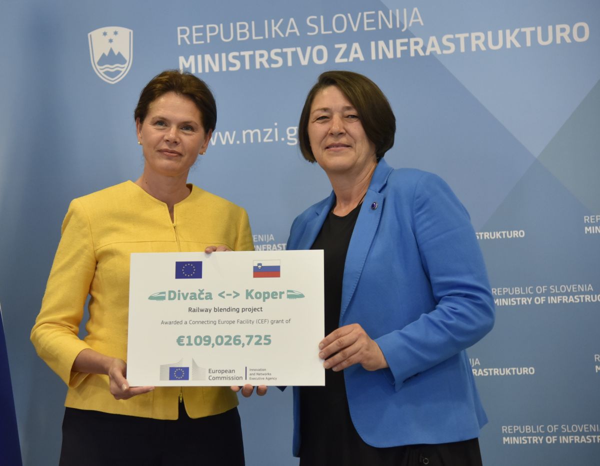 Evropska komisarka za promet Violeta Bulc je včeraj v Ljubljani ministrici za infrastrukturo Alenki Bratušek simbolično predala ček v vrednosti 109 milijonov evrov, ki jih je Slovenija pridobila za projekt izgradnje drugega železniškega tira med Divačo in Koprom. Sredstva bodo namenjena izgradnji sedmih predorov na trasi novega tira.