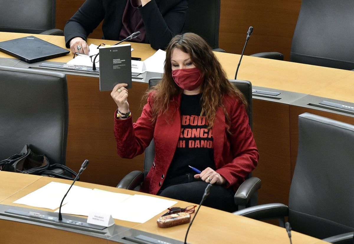 Poslanka je pozvala k prekiniti seje, saj naj bi se zaradi agresivnosti poslancev SDS počutila napadeno. Zaščitite nas opozicijske poslance, je pozvala predsedujočega DZ. »Zaščitite vsaj poslovnik in red v dvorani.«