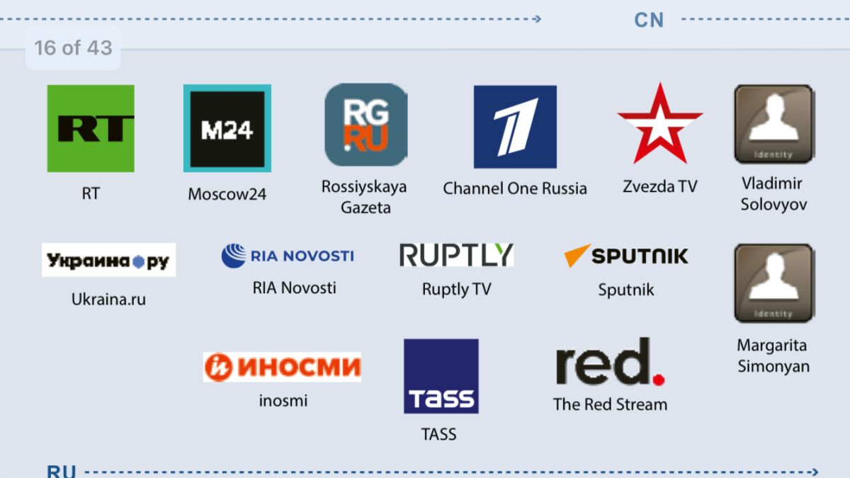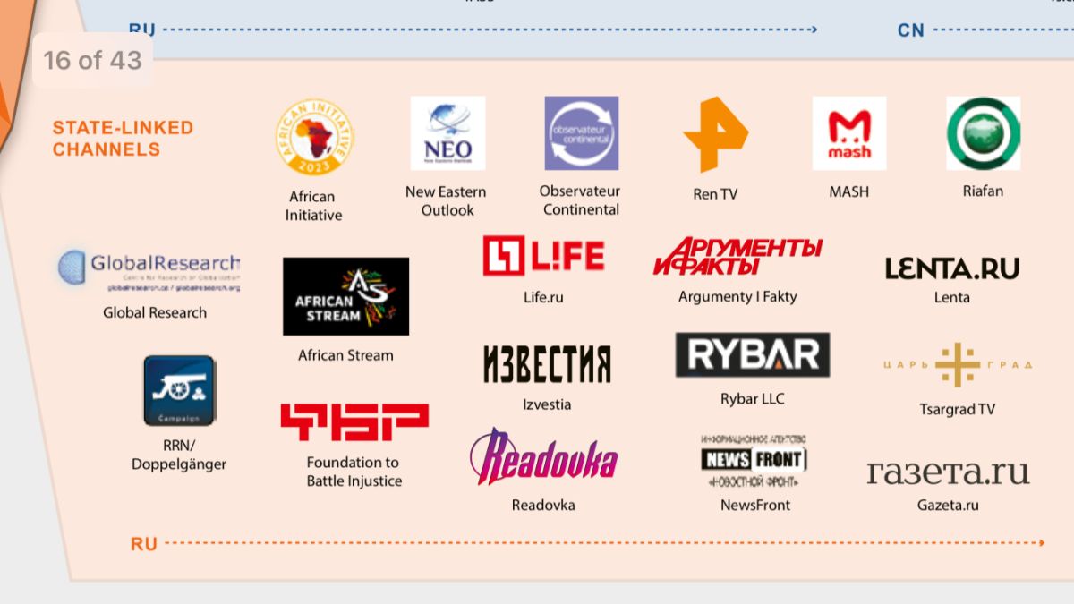 Poročilo Evropske službe za zunanje delovanje (EEAS) – načeluje ji Estonka Kaja Kallas, ena najbolj spletno napadanih evropskih političark, kar dokazuje, kako zelo jo Kremelj sovraži – iz marca 2025 je natančno zabeležilo ruske prstne odtise v kar 42 primerih. Služba za zunanje delovanje, ki med drugim skrbi tudi za zunanjo in varnostno politiko EU, je podrobneje analizirala ruske in kitajske grožnje zadnjih deset let, odkar je Rusija v hibridni vojni z evropskimi državami. Kanali, ki se uporabljajo za razširjanje dezinformacij, laži in manipulacij na družbenih omrežjih, so osredotočeni na omrežje X, Facebook in (lažne) spletne strani, v manjši meri pa potekajo prek Telegrama in Tik Toka. Sredstva, ki jih Rusija namenja za medijsko propagando v tujini, naj bi letos znašala vsaj 1,2 milijarde evrov. Glavna akterja »promoviranja« ruske ideologije in resnice sta paradržavna Russia Today (RT), ki je v 20 letih od ustanovitve postal globalna medijska korporacija, in portal Sputnik.