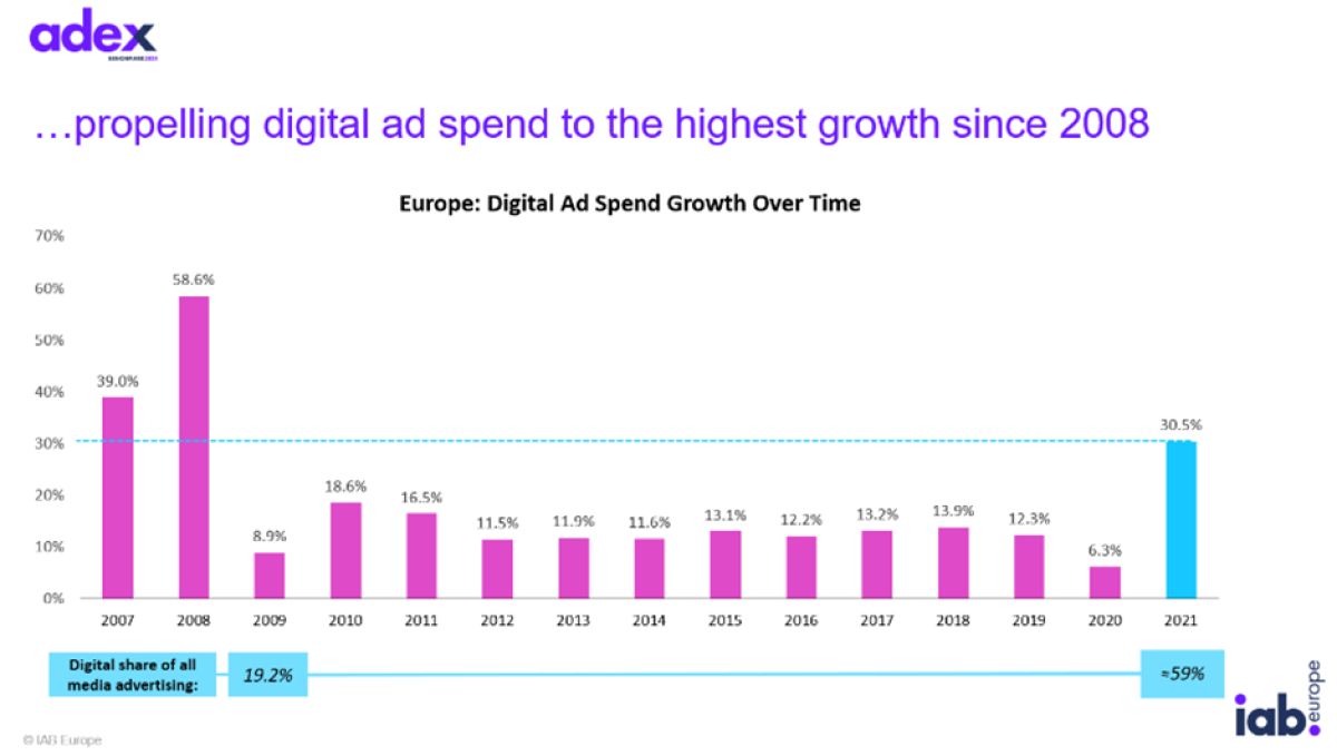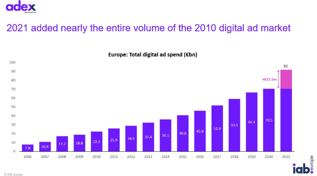Po njenih podatkih so investicije v digitalno oglaševanje lani poskočila kar za 30%, kar kaže na novo rekordno rast oglaševanja po letu 2008! Skupna vrednost digitalnega oglaševanja tako znaša 92 milijard Eur in predstavlja kar 59% vseh evropskih investicij v oglaševanje.