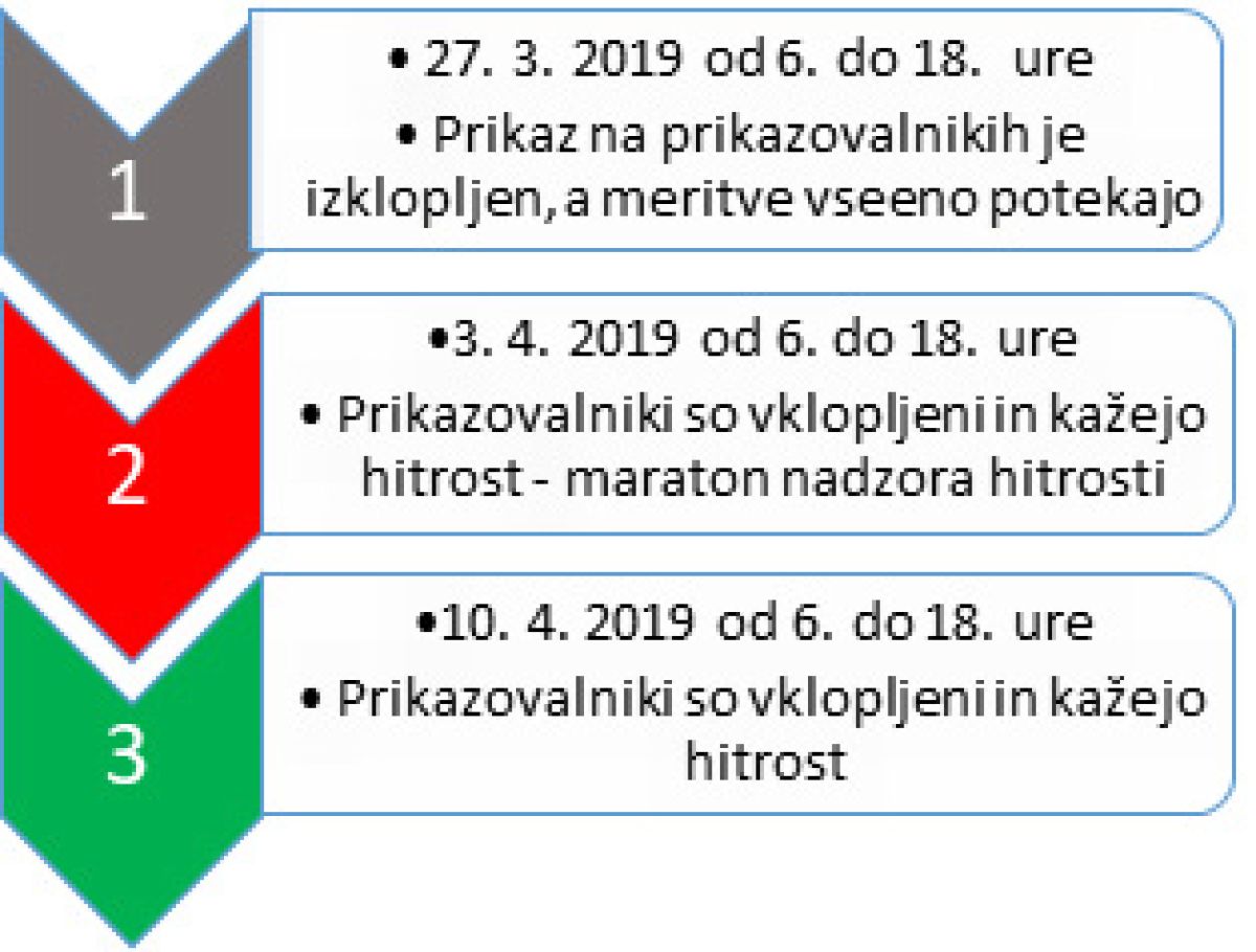 Povprečne hitrosti so bile največje 27. marca 2019, takrat ko je bil prikaz na prikazovalniku izklopljen, a so meritve vseeno potekale. Dne 3. aprila 2019, na dan, ko je potekal maraton nadzora hitrosti, so bile povprečne hitrosti na vseh lokacijah najnižje. V povprečju se je povprečna hitrosti na osmih prikazovalnikih zmanjšala za 2,7 km/h oz. 6,2 %. Percentil hitrosti V85 (hitrost, ki jo ne preseže 85 % vozil – realna vozna hitrost) se je zmanjšal za 2,9 km/h oz. za 6,0 %.