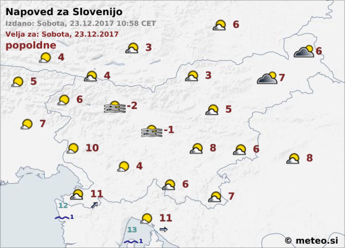 Najvišje dnevne temperature bodo v krajih z dolgotrajno meglo okoli 0, drugod od 3 do 7, na Primorskem do okoli 11 stopinj Celzija, je zapisano na spletnih straneh Agencije RS za okolje.