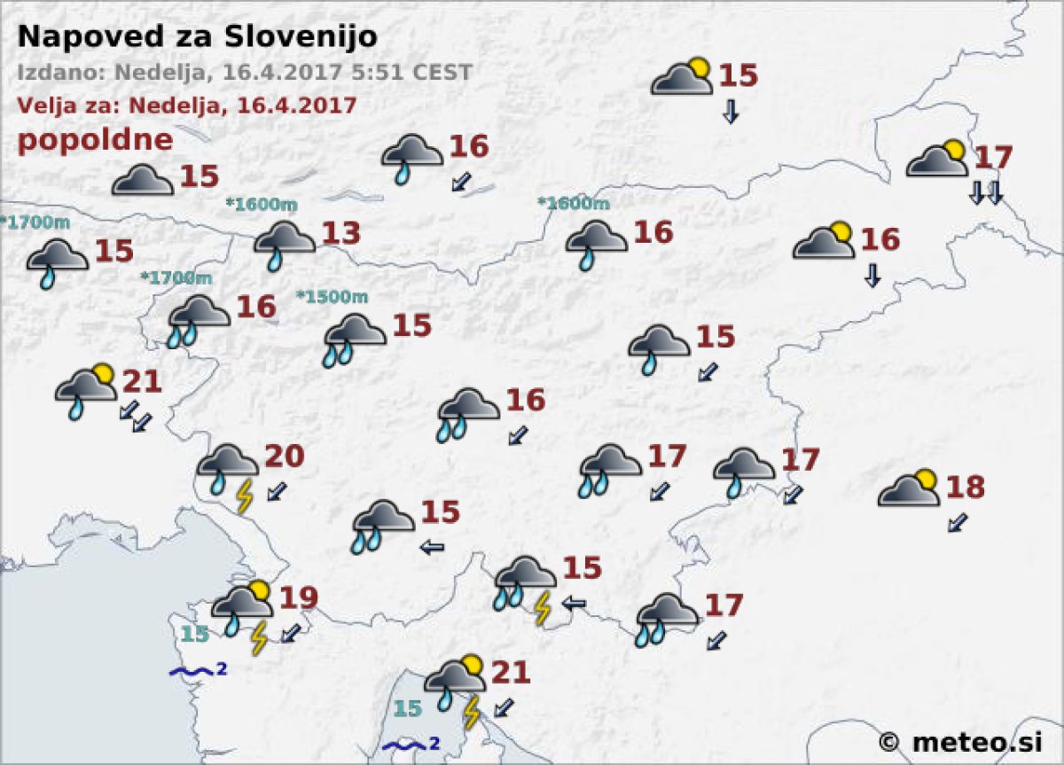 Danes dopoldne bo delno jasno in večinoma suho, sredi dneva in popoldne pa bo pretežno oblačno s padavinami, deloma plohami, na Primorskem tudi nevihtami.