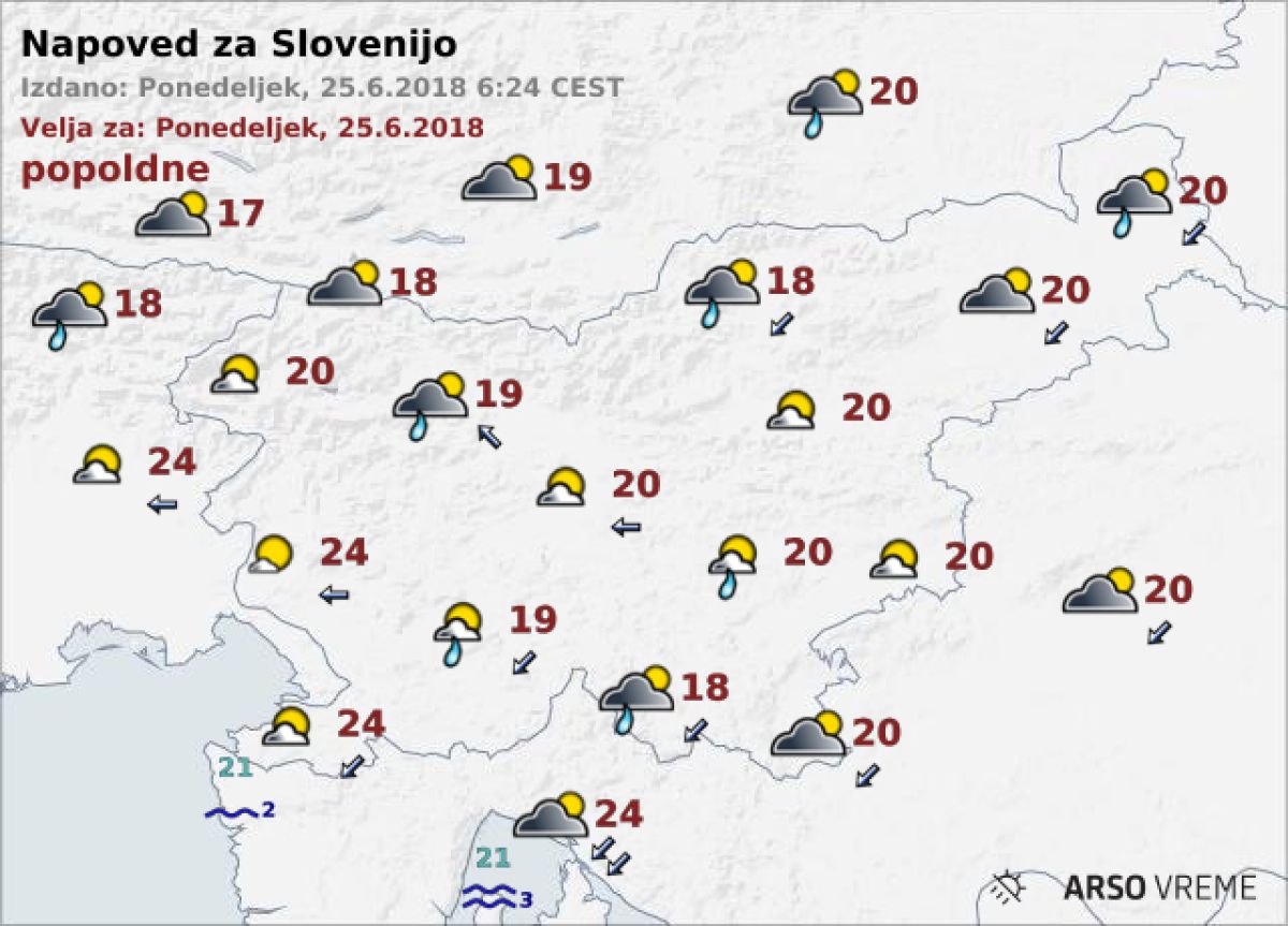 Danes bo dopoldne oblačno, dež bo do sredine dneva večinoma ponehal. Popoldne se bo delno zjasnilo, lahko še nastane kakšna ploha. Najvišje dnevne temperature bodo od 17 do 20, na Primorskem ob šibki burji do 24 °C.