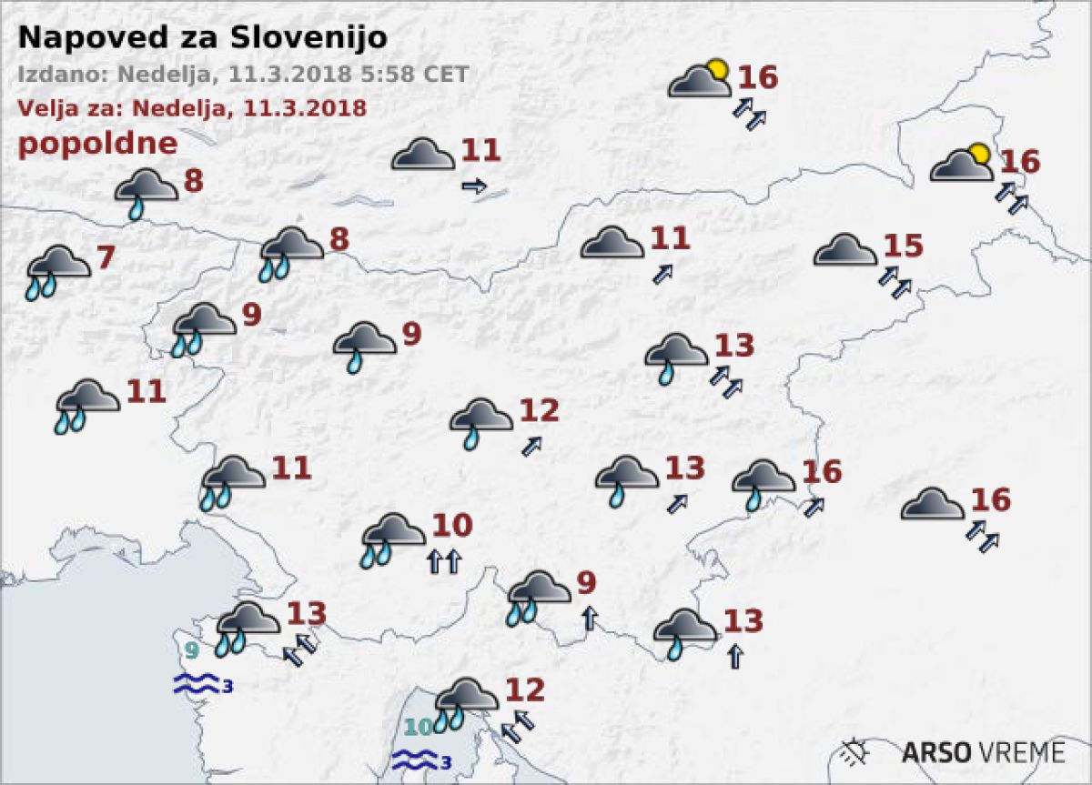 Jutri bo spremenljivo do pretežno oblačno, predvsem v zahodnih in osrednjih krajih bo občasno deževalo, deloma bodo krajevne plohe, lahko tudi zagrmi. Na vzhodu bo več sonca. Še bo pihal jugozahodnik. Najvišje dnevne temperature bodo od 8 do 13, na vzhodu do 15 °C.