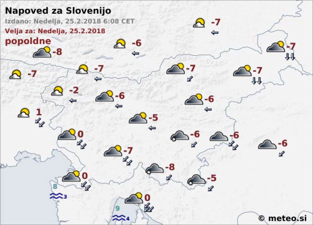 Pihal bo severovzhodni veter, na Primorskem zmerna do močna burja. Najvišje dnevne temperature bodo od -8 do -5, po nižinah Primorske okoli 0 °C.