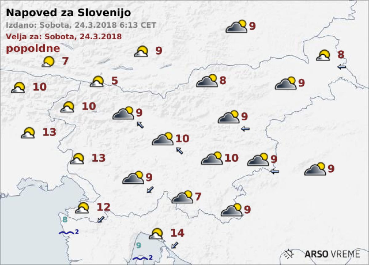Najvišje dnevne temperature bodo od 5 do 10, na Primorskem okoli 12 °C.