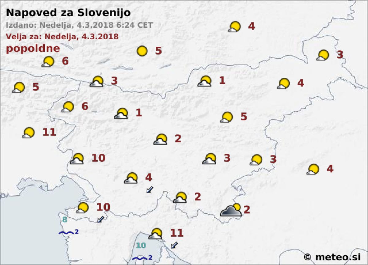 Na Primorskem bo pihala šibka burja. Najvišje dnevne temperature bodo od 1 do 5, na Primorskem do 10 °C.