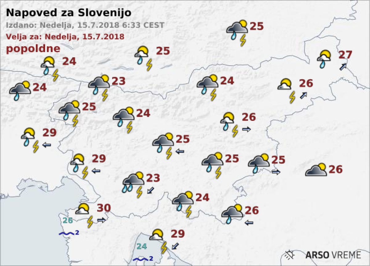 Jutri bo spremenljivo do pretežno oblačno. Predvsem v drugi polovici dneva bodo nastajale plohe in nevihte, ki se bodo nadaljevale tudi v noč na torek. Najnižje jutranje temperature bodo od 12 do 17, ob morju 19, najvišje dnevne od 23 do 28 °C.