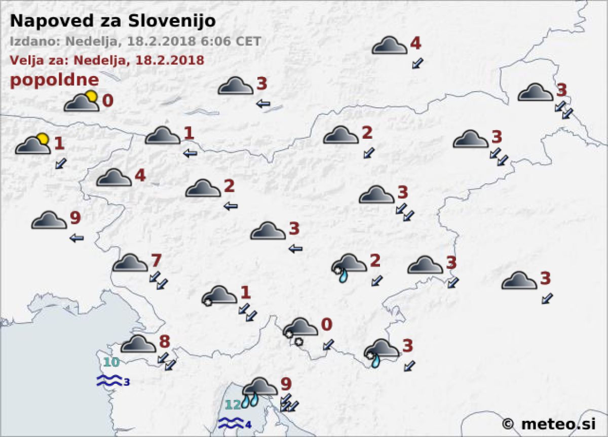 Na Primorskem bo deževalo, drugod večinoma snežilo. Zapihal bo severovzhodni veter, na Primorskem zmerna burja. Najvišje temperature bodo od 0 do 4, na Primorskem okoli 8 °C.