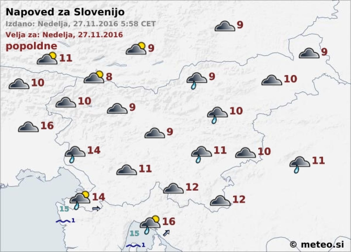 Danes bo oblačno, občasno bo ponekod rahlo deževalo. Najvišje dnevne temperature bodo od 8 do 11, na Primorskem do 14 stopinj Celzija.