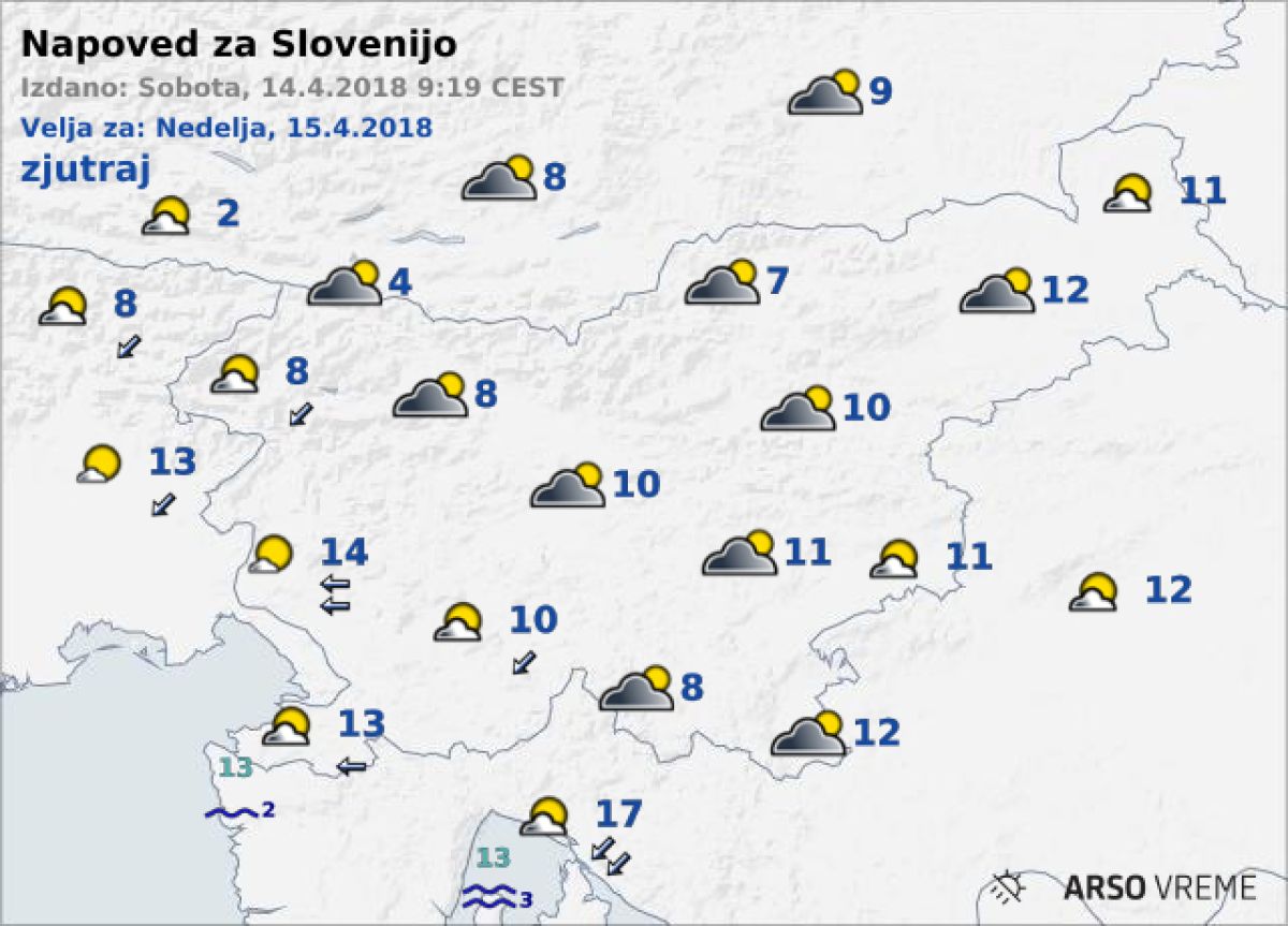 Jutri bo pretežno oblačno s krajevnimi plohami in nevihtami. Predvsem popoldne in zvečer bodo ob nevihtah možni nalivi. Ponekod bo čez dan pihal vzhodni veter, na Primorskem šibka burja. Najnižje jutranje temperature bodo od 9 do 16, najvišje dnevne od 17 do 22 °C.