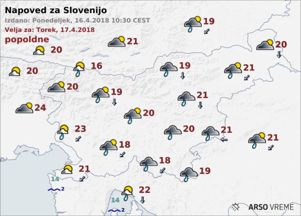 Na Štajerskem in v Prekmurju bo zapihal severovzhodni veter, na Primorskem šibka burja. Najvišje dnevne temperature bodo od 16 do 21, na Goriškem in ob morju okoli 23 °C.