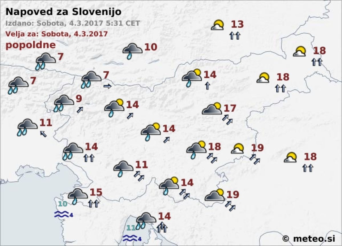Dopoldne se bodo na zahodu pričele pojavljati rahle padavine, ki se bodo popoldne krepile in zvečer razširile proti vzhodu. Pihal bo okrepljen jugozahodni veter, ob morju jugo. Najvišje dnevne temperature bodo od 7 do 14, na vzhodu do 19 stopinj C.
