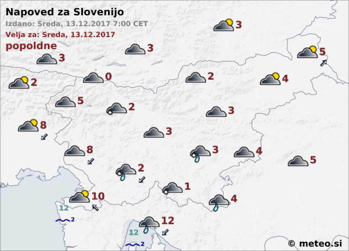 Popoldne bodo padavine oslabele in do večera povečini prehodno ponehale. V Vipavski dolini in na Krasu bo pihala šibka burja. Najvišje dnevne temperature bodo od 0 do 5, na Primorskem do 10 °C.