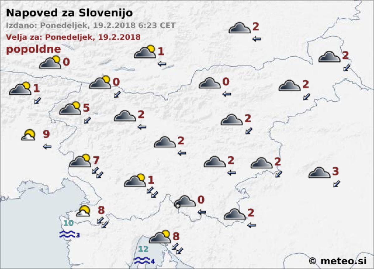 Jutri bo oblačno, na zahodu bo povečini suho, drugod bo občasno rahlo snežilo, nekoliko pogosteje v vzhodni polovici Slovenije. Na Primorskem bo še pihala šibka do zmerna burja, tudi v notranjosti Slovenije bo še vetrovno. Najvišje dnevne temperature bodo od -1 do 2, na Primorskem do 7 °C.