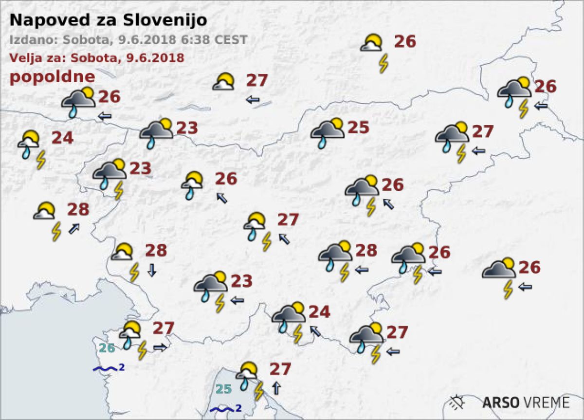 Danes bo spremenljivo oblačno, zjutraj bo ponekod megla. Popoldne bodo nastale plohe in posamezne nevihte. Najvišje dnevne temperature bodo od 23 do 28 °C.