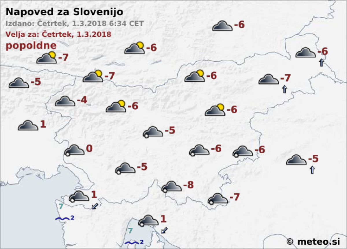Najvišje dnevne temperature bodo od -8 do -4, po nižinah Primorske okoli 0 °C.