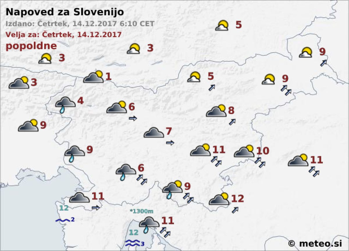 Predvsem na Primorskem in Notranjskem bodo občasno krajevne padavine. Meja sneženja se bo na jugozahodu dvignila na nadmorsko višino okoli 1100 m, na severozahodu pa na okoli 800 m. Pihal bo zmeren, na severovzhodu in ponekod v višjih legah zjutraj in dopoldne okrepljen jugozahodni veter. Najvišje dnevne temperature bodo od 4 do 12 °C.