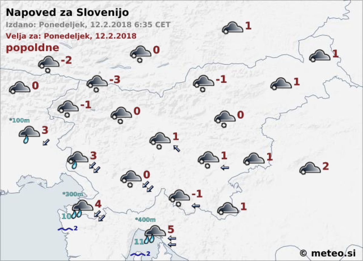 Danes bo oblačno. Od severa in zahoda bo sneženje čez dan postopno zajelo vso državo, le po nižinah Primorske bo večinoma deževalo.