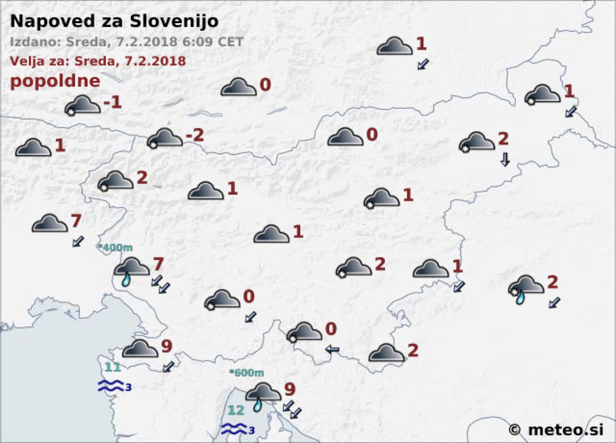 Danes bo oblačno s padavinami, ki bodo proti poldnevu oslabele in prehodno ponekod tudi ponehale. V notranjosti Slovenije bo snežilo, v nižjih legah Primorske pa deževalo. Na Primorskem bo pihala zmerna burja, ki bo čez dan počasi slabela. Najvišje dnevne temperature bodo od -2 do 2, na Primorskem do okoli 8 °C.