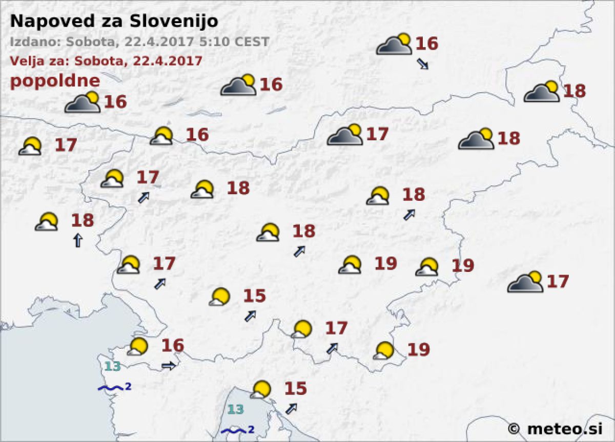Danes dopoldne bo precej jasno, popoldne pa se bo od severa zmerno pooblačilo, bolj oblačno bo v severovzhodnih krajih. Ponekod bo čez dan zapihal jugozahodnik. Najvišje dnevne temperature bodo od 15 do 19 stopinj C.