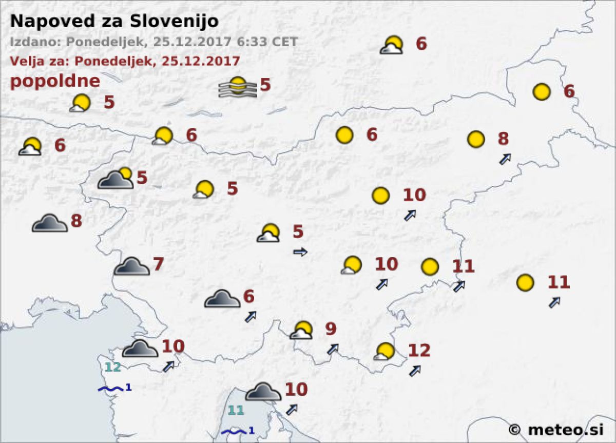 Danes bo precej jasno, le na Primorskem in Notranjskem se bo postopno pooblačilo. Dopoldne bo ponekod še megleno. Čez dan bo tudi marsikje po nižinah zapihal jugozahodni veter. Najvišje dnevne temperature bodo od 5 do 12 °C.