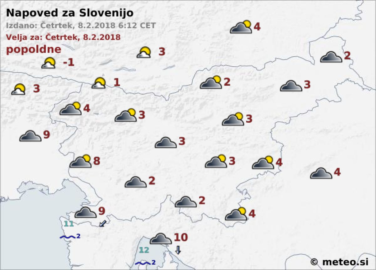 Popoldne se bodo ponekod oblaki prehodno trgali. Najvišje dnevne temperature bodo od 0 do 4, na Primorskem do okoli 9 °C.