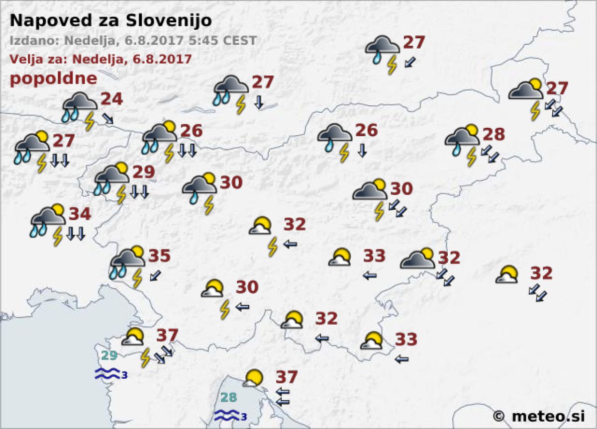 Predvsem v zahodni in južni Sloveniji bodo zvečer ob prehodu hladne fronte tudi krajevna neurja. Pihal bo vzhodni veter, na Primorskem zvečer večinoma zmerna burja. Najnižje jutranje temperature bodo od 16 do 21 stopinj Celzija, najvišje dnevne pa od 26 do 32. Na jugu Slovenije se po napovedih Arsa živo srebro lahko povzpne tudi do 35 stopinj Celzija.