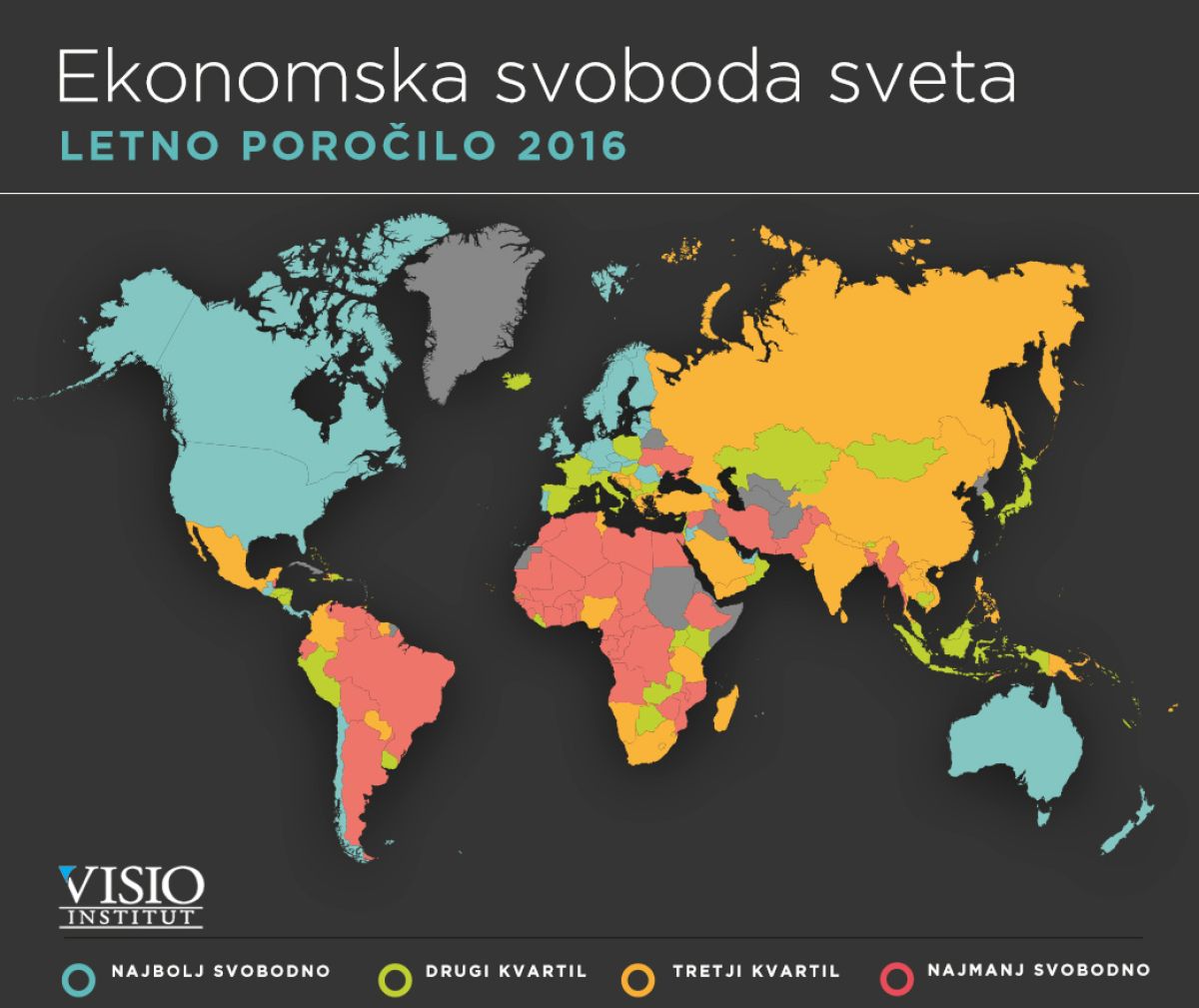 Na najnovejši svetovni lestvici, ki jo objavlja Visio institut (Ekonomska svoboda sveta: letno poročilo 2016), je Slovenija med 159 državami in ozemlji zasedla 97. mesto. To mesto si deli s Surinamom, južnoameriško državo z bruto domačim proizvodom na prebivalca več kot dvakrat nižjim od slovenskega. Po šestih letih nazadovanja na lestvici je Slovenija letos sicer napredovala za 14 mest, vendar je še zmeraj zaostaja za svojim vrhom, ki ga je dosegla leta 2010, ko so bili analizirani podatki iz leta 2008.