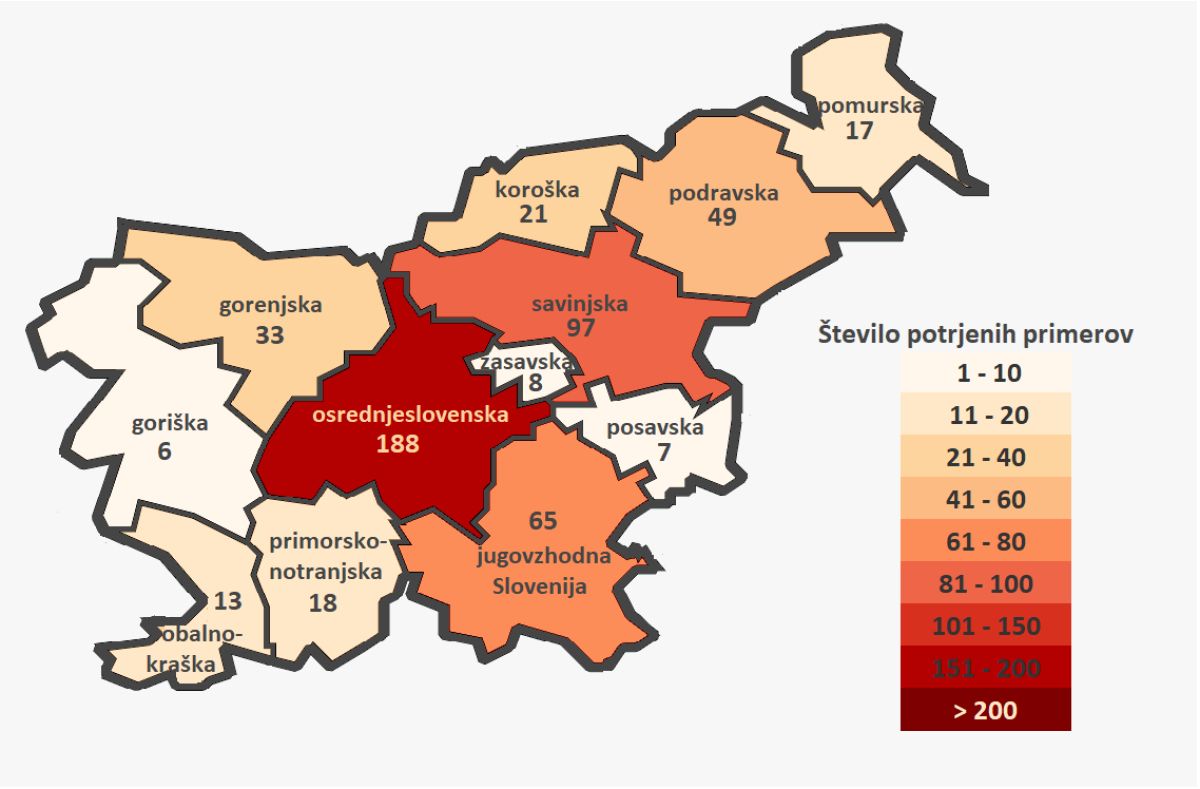 Po epidemioloških podatkih obolele osebe prihajajo iz naslednjih statističnih regij: 188 iz osrednjeslovenske, 97 iz savinjske, 65 iz jugovzhodne Slovenije, 49 iz podravske, 33 iz gorenjske, 21 iz koroške, 18 iz primorsko-notranjske, 17 iz pomurske, 13 iz obalno-kraške, osem iz zasavske, sedem iz posavske ter šest iz goriške regije. Štirje oboleli so tuji državljani. Epidemiološka obravnava potrjenih primerov je v teku.
