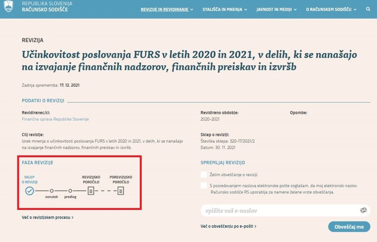 Posnetek zaslona s spletne strani Računske sodišča, ki dokazuje, da se revizija še ni začela izvajati. Do sedaj je bil izdan le Sklep o reviziji.