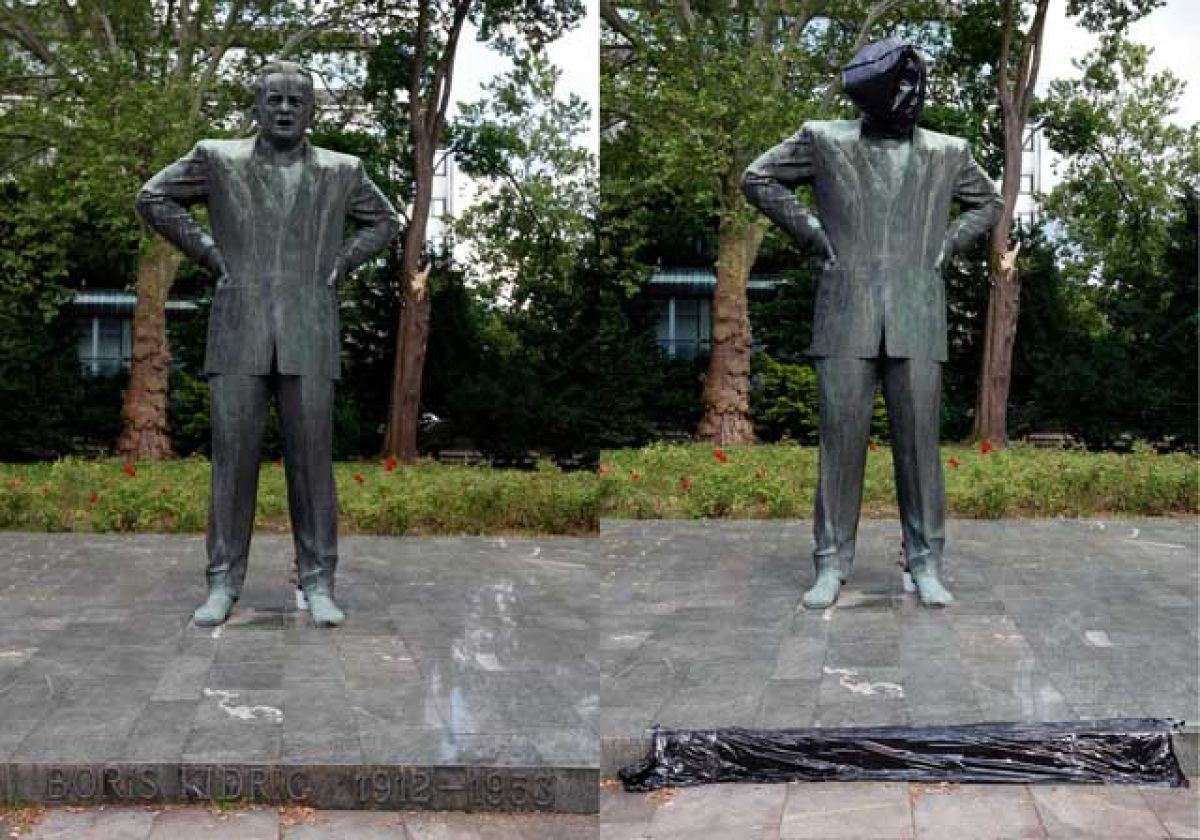 Zakrit obraz, prelepljeno ime: podmladek SDS je »anonimiziral« kip Borisa Kidriča