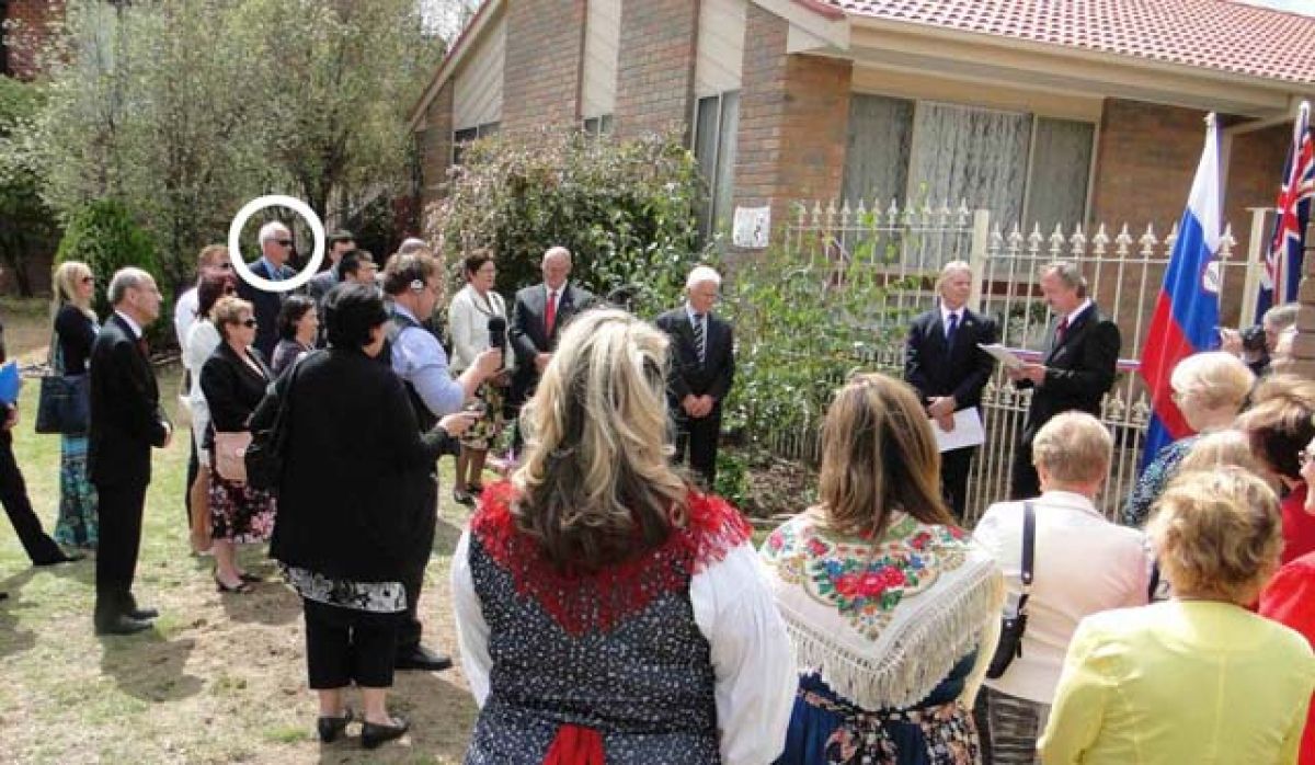 Nekdanji veleposlanik v Avstraliji Milan Balažic, odpoklican zaradi druženja s pedofilom Nicholasom Omanom (na fotografiji označen levo od govorca Balažica), se je obregnil ob medije, ki ga ob razkritju grehov slovenskih diplomatov mečejo v isti koš z veleposlaniki in drugim diplomatskim osebjem, ki je oškodovalo državni proračun.